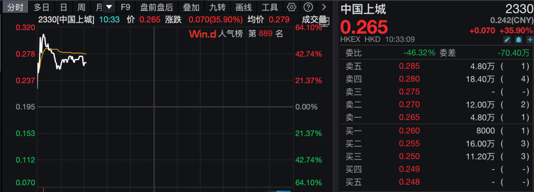 港股中国上城涨超35%。消息面上,中国上城公告,公司已与配售代理签订协议,将以每股0.180港元的配售价,按尽力基准配售最多7547.43万股新股份。此次配售股份约占扩大后总股数的16.67%,配售价较10月16日收盘价(0.195港元)折让约7.69%。此次配售预计净筹集款项约1352万港元,将用于公司一般营运资金,包括员工成本、专业费用、租金及一般行政和营运开支。