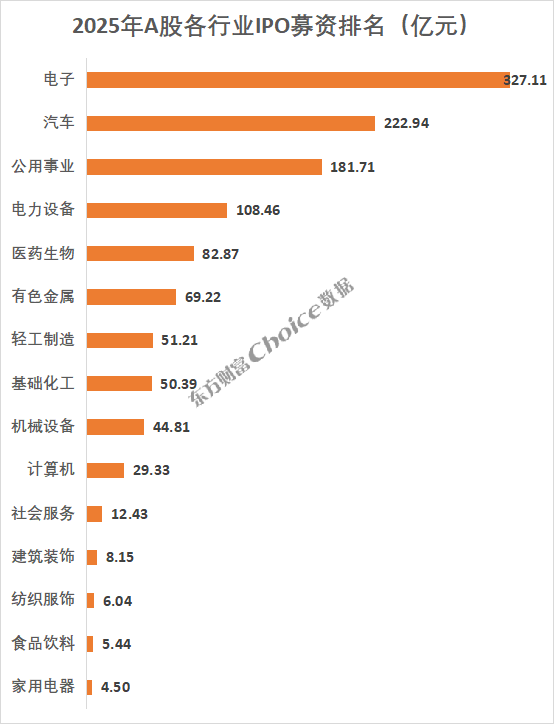 高科技产业依然是IPO重点倾斜方向。其中,电子行业年内上市企业18家,累计募资金额327.11亿元,位居首位。排名第二至第五的行业是汽车、公用事业、电力设备和医药生物,募资金额分别为222.94亿元、181.71亿元、108.46亿元、82.87亿元。