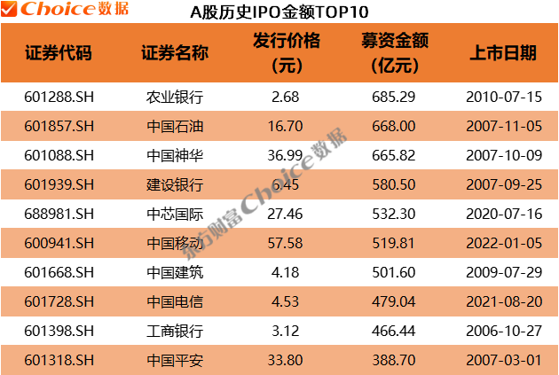 Choice数据统计,截至目前,A股史上最大IPO为农业银行,2010年该股首发上市,募集资金685.29亿元。排名第二、第三的是中国石油、中国神华,分别募集资金668亿元、665.82亿元。