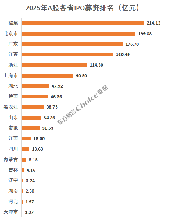 募资金额方面,福建位居首位,共有3家企业上市,累计募集资金214.13亿元;北京、广东、江苏、浙江位列第二至第五,辖区内IPO企业分别募集资金199.08亿元、176.7亿元、160.49亿元、114.3亿元。年内新股中签盈利最大的两只新股沐曦股份、摩尔线程分别来自上海、北京。