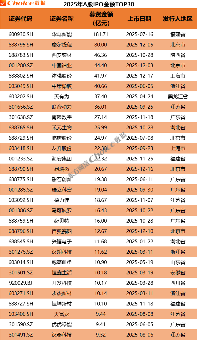 具体来看,年内首发上市的104家企业中有14家募集资金超过20亿元,超百亿元的仅有华电新能1家。摩尔线程、西安奕材、中国铀业、沐曦股份排名第二至第五,募资金额分别为80亿元、46.36亿元、44.4亿元、41.97亿元。