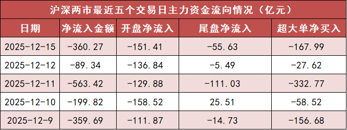 今日(12月15日)沪深两市主力资金开盘净流出151.41亿元,尾盘净流出55.63亿元,两市全天资金净流出360.27亿元。