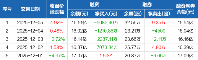 中国人保融资融券信息显示,2025年12月5日融资净偿还5086.4万元;融资余额15.51亿元,较前一日下降3.18%。