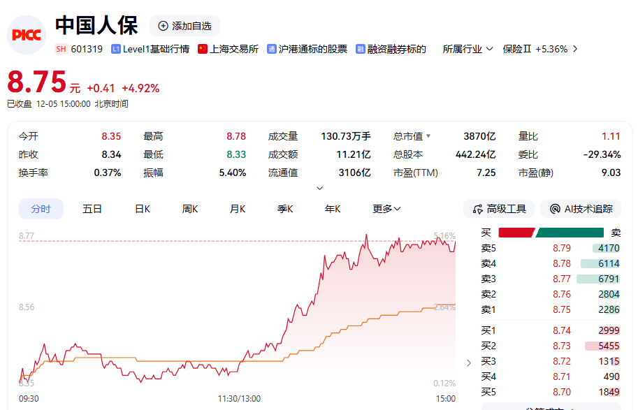 截至12月5日收盘,中国人保A股股价报8.75元/股,总市值3870亿元。