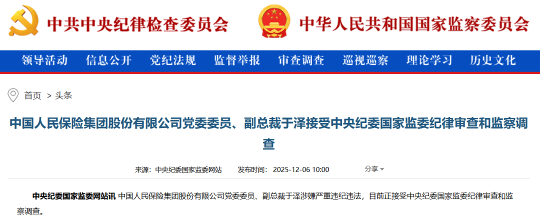 据中央纪委国家监委网站消息,中国人民保险集团股份有限公司党委委员、副总裁于泽涉嫌严重违纪违法,目前正接受中央纪委国家监委纪律审查和监察调查。