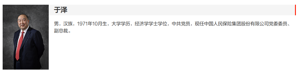 公开信息显示,于泽出生于1971年10月,先后任职太平保险有限公司、太平财产保险有限公司,曾任太平保险有限公司天津分公司总经理,太平保险有限公司市场总监,太平财产保险有限公司助理总经理、副总经理、副总经理(主持工作)、总经理等职。