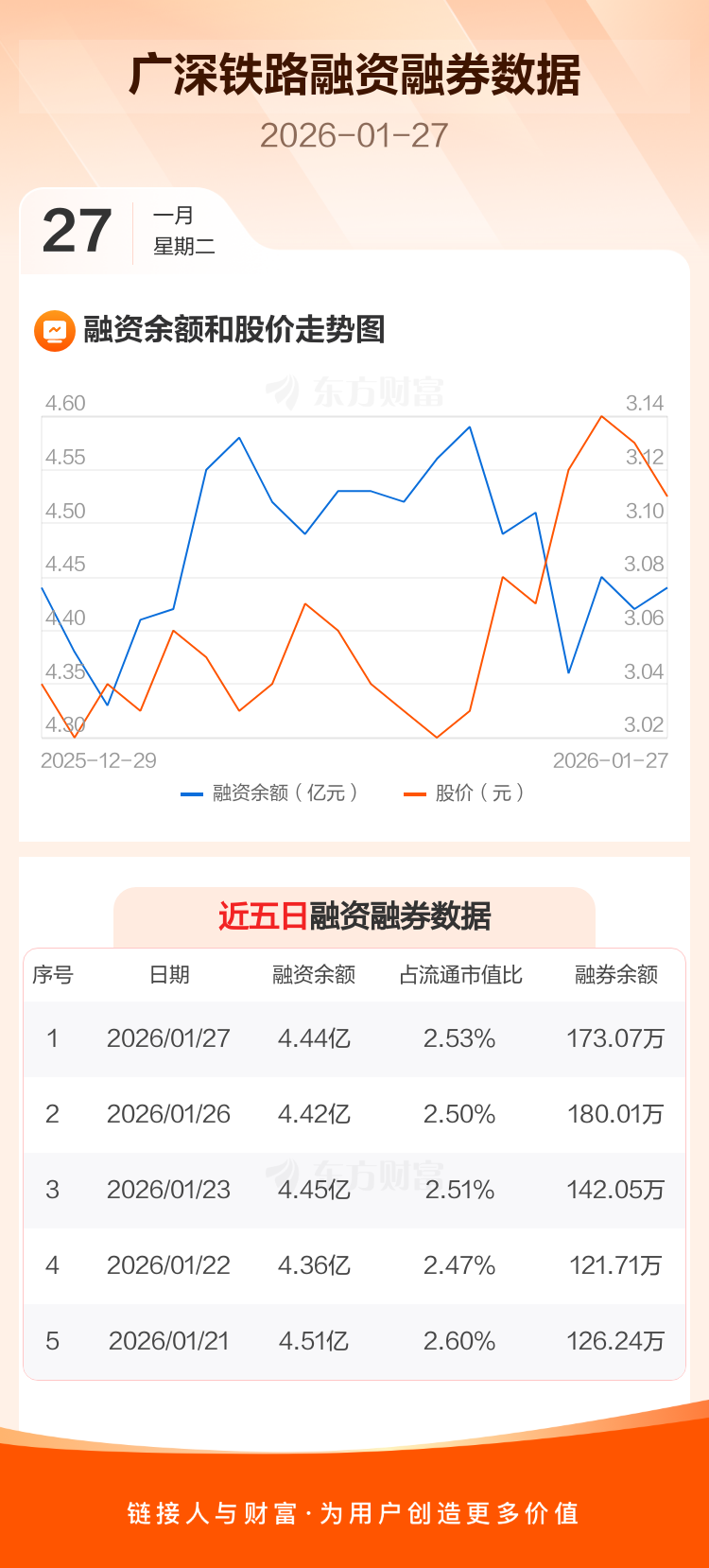 交易所最新数据显示,广深铁路于2026年1月27日获融资买入2528.55万元,融资偿还2268.54万元,当日融资净买入260.01万元。目前,该股融资余额4.44亿,占流通市值比例为2.53%。