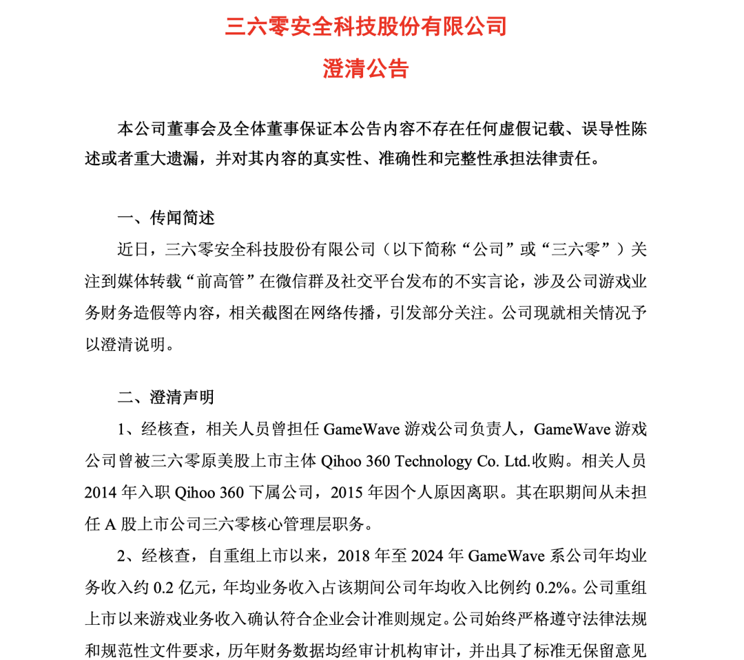 12月16日,三六零发布澄清公告,近日,公司关注到媒体转载“前高管”在微信群及社交平台发布的不实言论,涉及公司游戏业务财务造假等内容,相关截图在网络传播,引发部分关注。公司现就相关情况予以澄清说明。