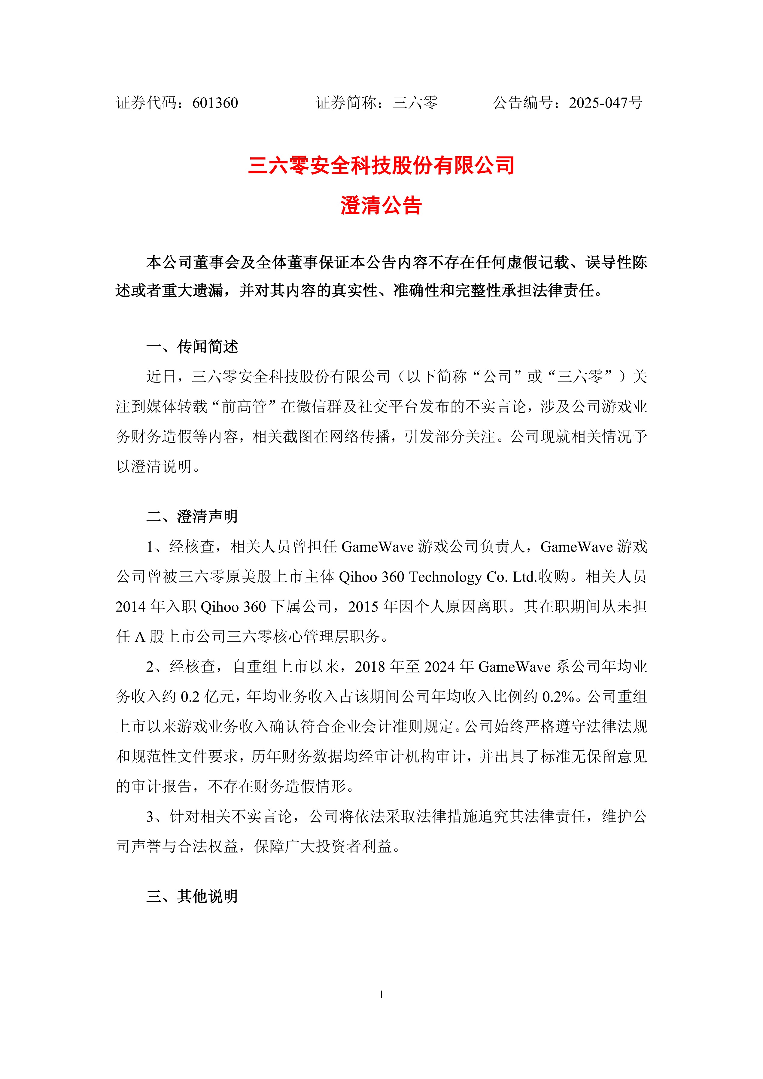 三六零发布公告回应称,相关人员(即玉红)曾担任GameWave游戏公司负责人,GameWave游戏公司曾被三六零原美股上市主体Qihoo360TechnologyCo.Ltd.收购。他于2014 年入职Qihoo 360 下属公司,2015年因个人原因离职,在职期间从未担任A股上市公司三六零核心管理层职务。自重组上市以来,2018年至2024年GameWave系公司年均业务收入约0.2亿元,年均业务收入占该期间公司年均收入比例约0.2%。公司重组上市以来游戏业务收入确认符合企业会计准则规定。公司还表示,针对相关不实言论,公司将依法采取法律措施追究其法律责任。周鸿祎微博也发布了相关澄清声明。