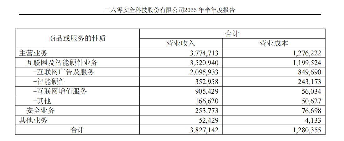 中报显示,从单项业务看,三六零的安全业务营收下滑。今年上半年,公司主营业务较2024年同期增长3.63%。其中,互联网及智能硬件业务、其他业务的营收分别同比增长4.97%、6.06%;安全业务去年全年的收入占同期主营业务收入的比例已缩水至不到12%,今年则进一步下滑,同比减少11.89%,占比只有6.72%。