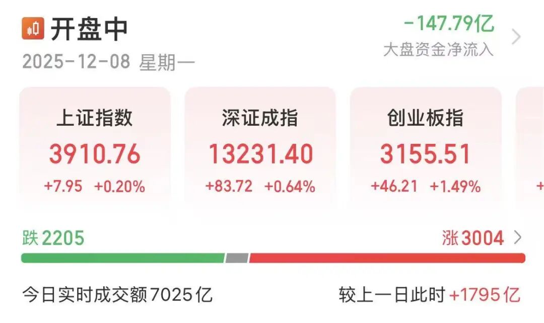 12月8日早盘,A股三大股指高开高走,截至发稿,沪指涨0.2%,深证成指涨0.64%,创业板指涨超1%。全市场上涨个股超3000只。