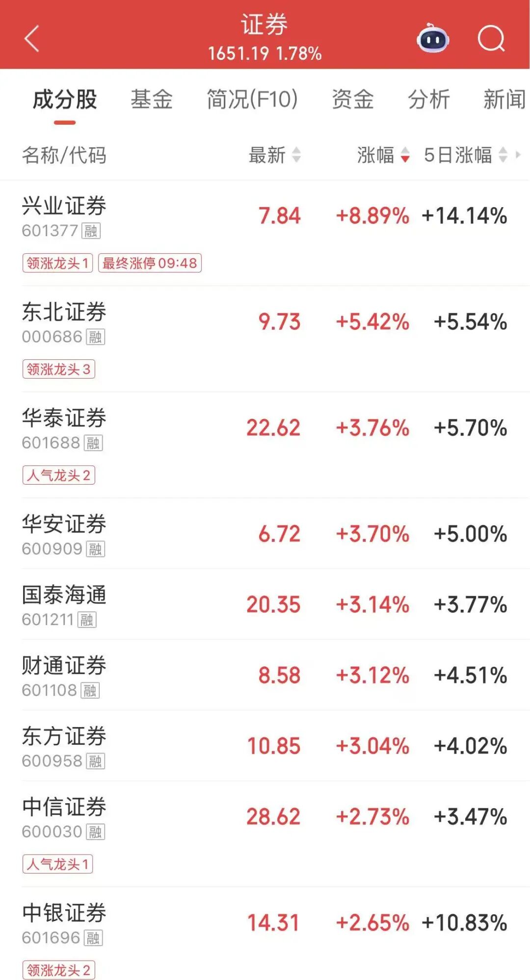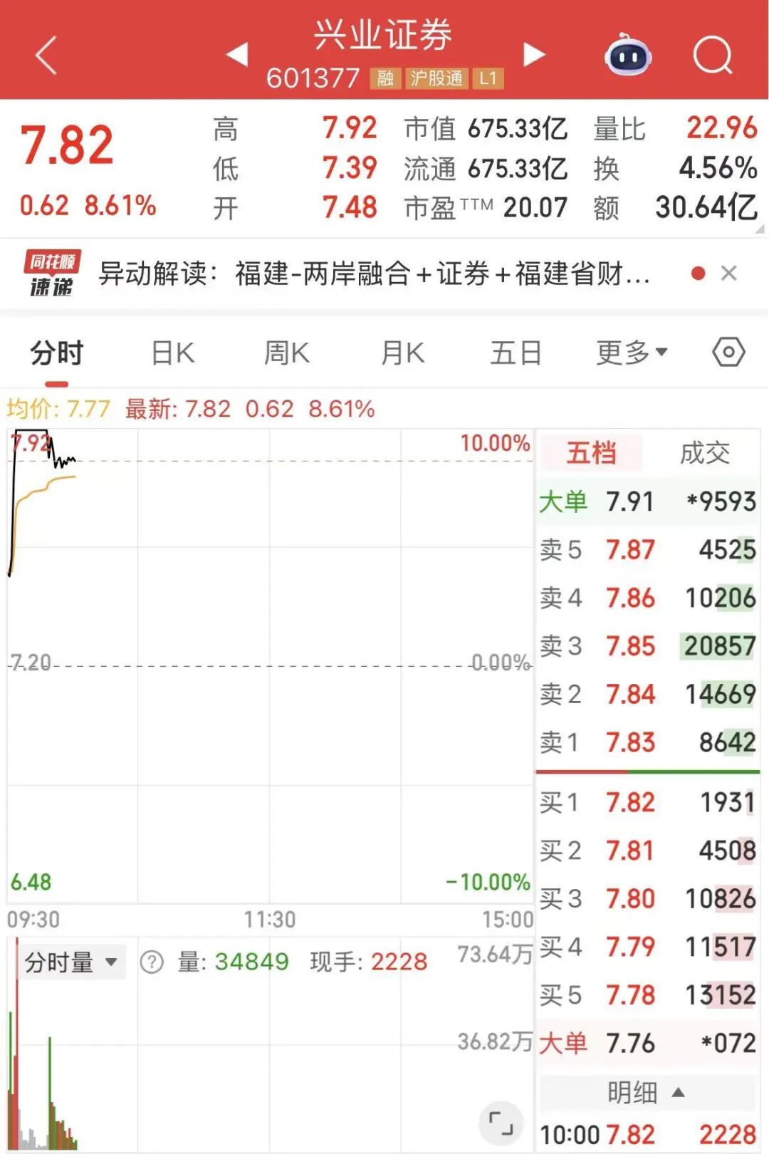证券板块开盘走高,兴业证券(601377)开盘后快速拉升,三分钟涨停,随后打开涨停板,截止发稿,涨超8%。东北证券、华泰证券、华安证券、国泰海通跟涨。