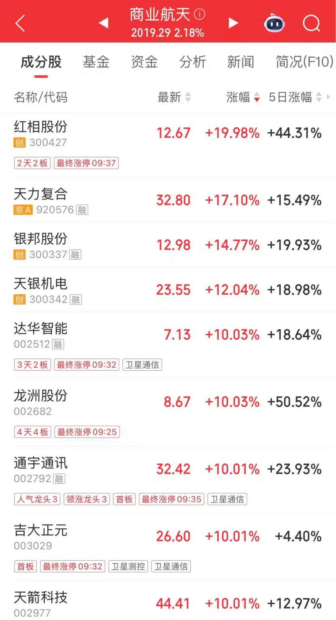 商业航天板块持续走高,红相股份“20cm”涨停,达华智能、龙洲股份、通宇通讯、吉大正元、天箭科技等多股涨停,天力复合、银邦股份、天银机电涨幅居前。