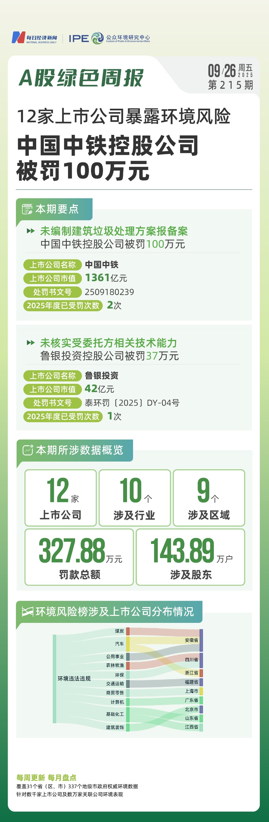 一周绿鉴:中国中铁控股公司收到100万元罚单