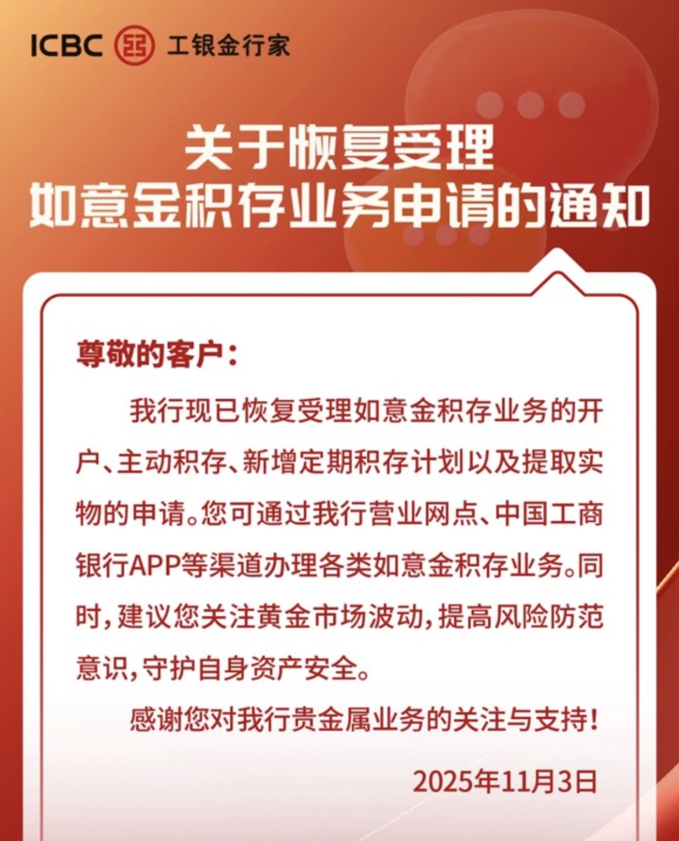 #后续工商银行公告称,现已恢复受理如意金积存业务的开户。