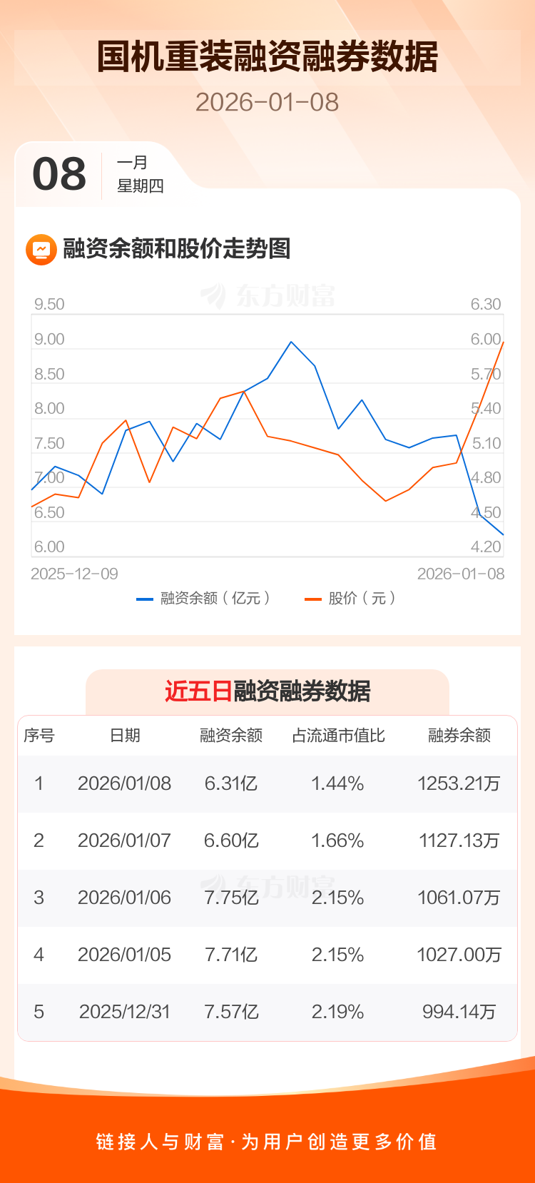 交易所最新数据显示,国机重装于2026年1月8日获融资买入1.37亿元,融资偿还1.66亿元,当日融资净偿还2915.67万元。目前,该股融资余额6.31亿,占流通市值比例为1.44%。