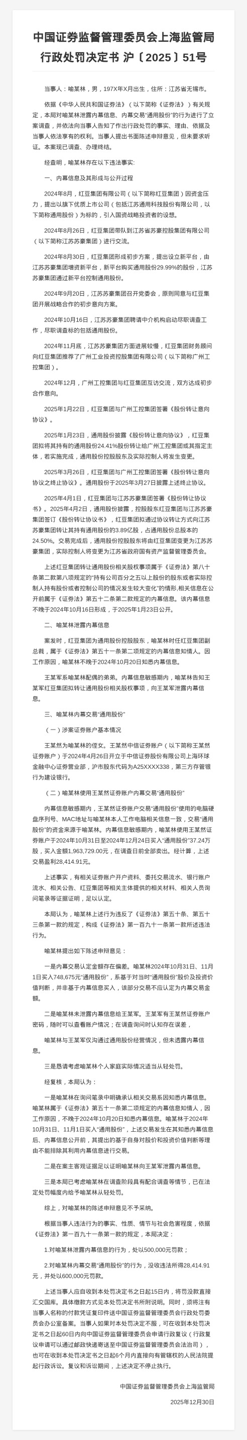 喻某林上述行为违反了《证券法》的规定。中国证券监督管理委员会上海监管局决定:对喻某林泄露内幕信息的行为,处以50万元罚款;对喻某林内幕交易“通用股份”的行为,没收违法所得28,414.91元,并处以60万元罚款。