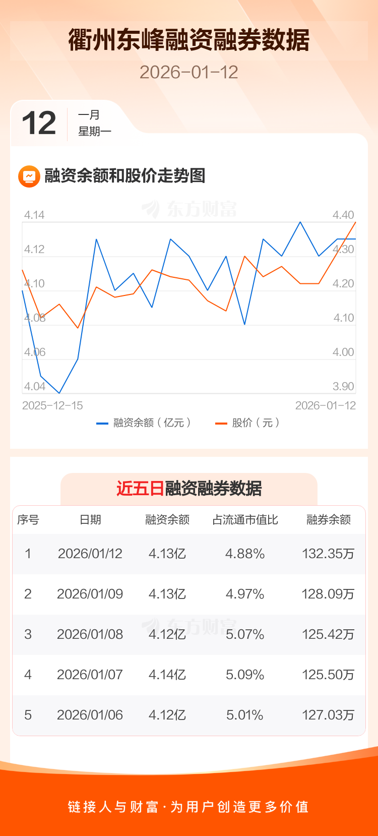 交易所最新数据显示,衢州东峰于2026年1月12日获融资买入1417.28万元,融资偿还1327.74万元,当日融资净买入89.54万元。目前,该股融资余额4.13亿,占流通市值比例为4.88%。