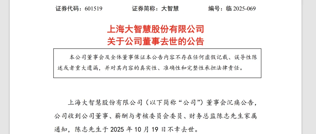 10月20日,大智慧(601519.SH)沉痛公告,公司收到公司董事、薪酬与考核委员会委员、财务总监陈志先生家属通知,陈志先生于2025年10月19日不幸去世。