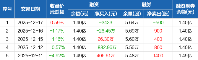 融资方面,当日融资买入173.21万元,融资偿还173.55万元,融资净偿还3433元。融券方面,融券卖出0股,融券偿还500股,融券余量5.64万股,融券余额9.59万元。融资融券余额合计1.4亿元。