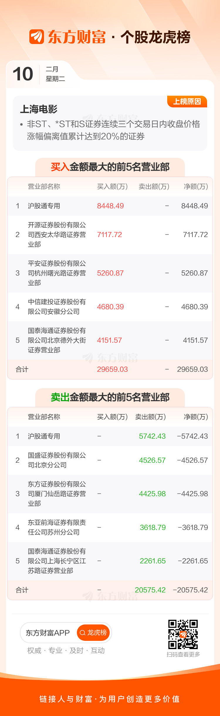 上海电影(601595)龙虎榜数据(02-10)