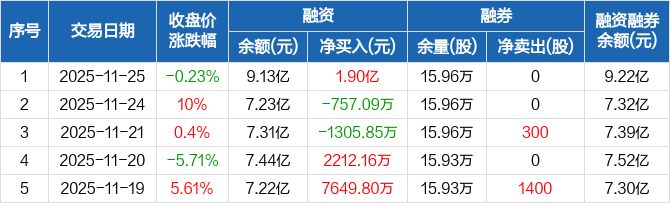 融资方面,当日融资买入5.67亿元,融资偿还3.77亿元,融资净买入1.9亿元,净买入额两市排名第十。融券方面,融券卖出0股,融券偿还0股,融券余量15.96万股,融券余额914.51万元。融资融券余额合计9.22亿元。