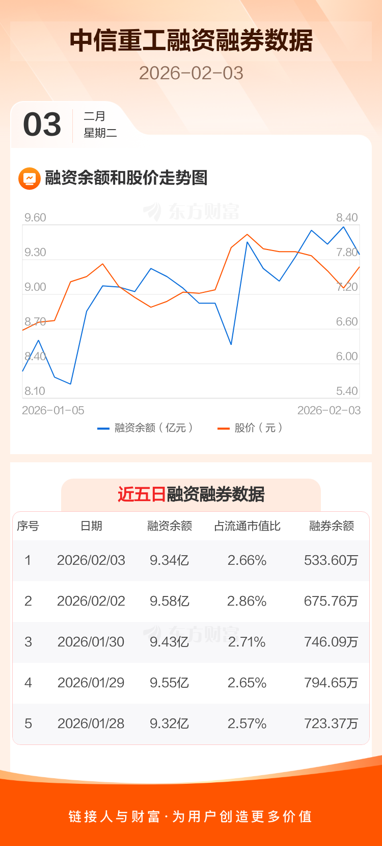 交易所最新数据显示,中信重工于2026年2月3日获融资买入4509.86万元,融资偿还6915.31万元,当日融资净偿还2405.45万元。目前,该股融资余额9.34亿,占流通市值比例为2.66%。