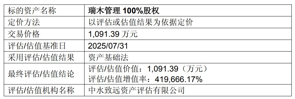 相比于上述有色资源类标的的评估增值,瑞木管理100%股权评估价值为1091.39万元,相对于净资产账面价值0.26万元,评估增值1091.13万元,增值率为419666.17%。