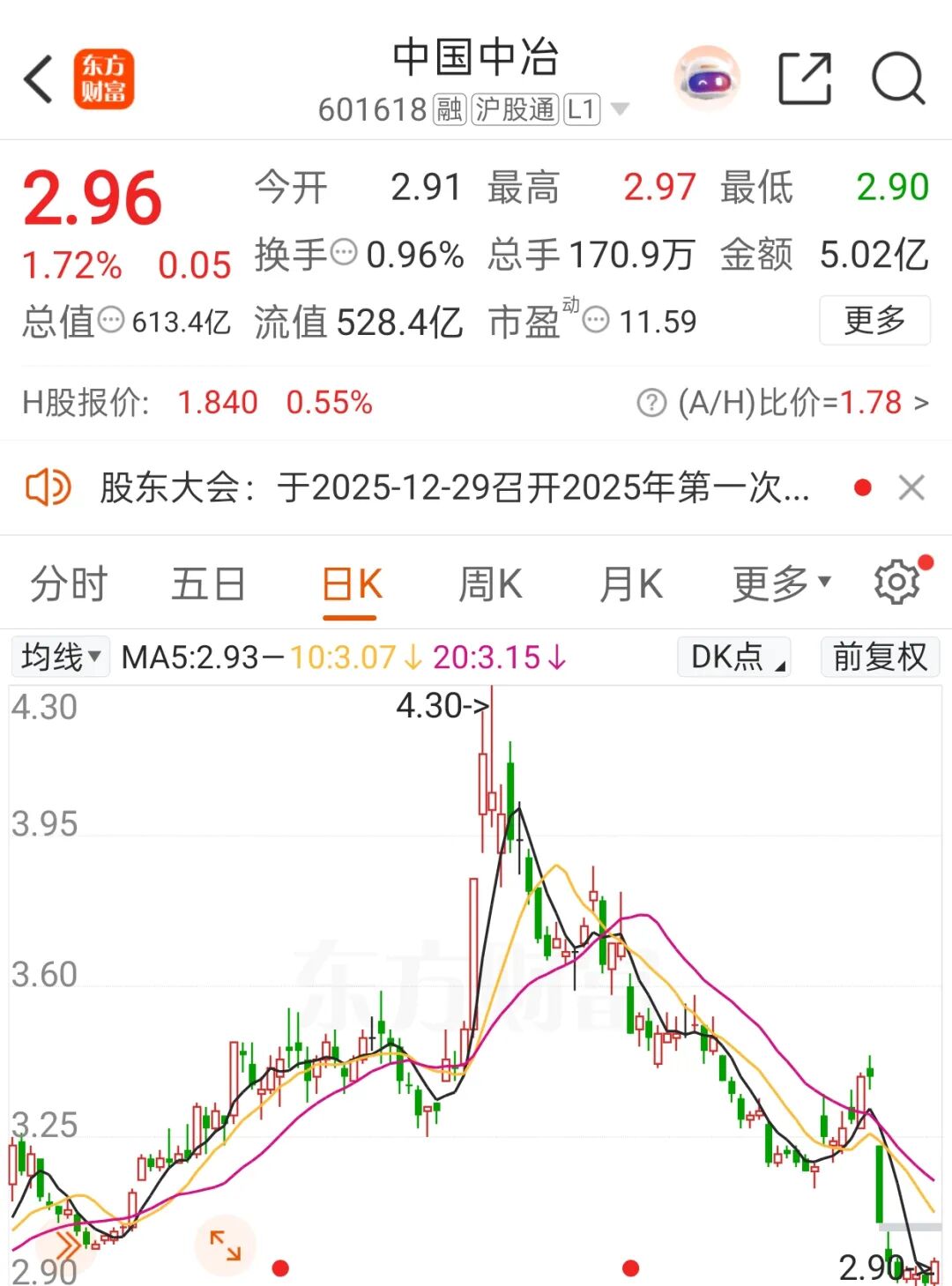 截至12月17日,中国中冶报2.96元/股,上涨1.72%,总市值超600亿元。