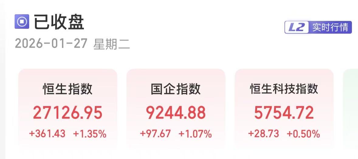 上证报中国证券网讯1月27日,港股三大指数收涨。截至收盘,恒生指数涨1.35%,报27126.95点;恒生国企指数涨1.07%,报9244.88点;恒生科技指数涨0.5%,报5754.72点。