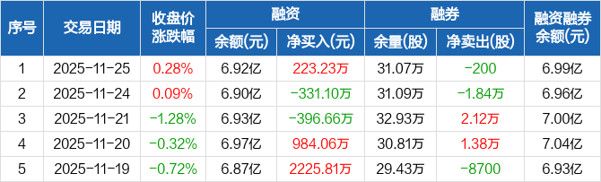 融资方面,当日融资买入1677.06万元,融资偿还1453.83万元,融资净买入223.23万元。融券方面,融券卖出5000股,融券偿还5200股,融券余量31.07万股,融券余额674.16万元。融资融券余额合计6.99亿元。