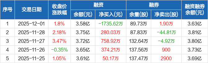 旗滨集团融资融券信息显示,2025年12月1日融资净偿还1735.62万元;融资余额3.58亿元,较前一日下降4.63%。