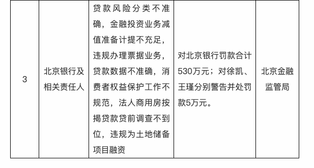 北京银行因“贷款风险分类不准确,金融投资业务减值准备计提不充足,违规办理票据业务,贷款数据不准确,消费者权益保护工作不规范,法人商用房按揭贷款贷前调查不到位,违规为土地储备项目融资”等违法违规行为,被北京金融监管局处罚款合计530万元,相关负责人徐凯、王瑾分别被警告并处罚款5万元。