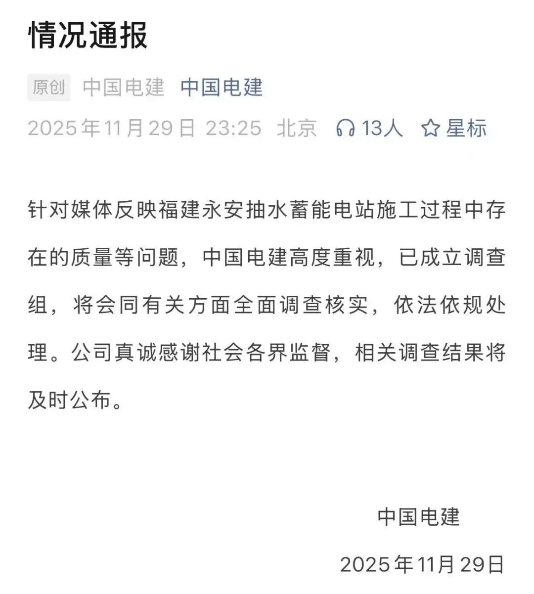 针对媒体反映福建永安抽水蓄能电站施工过程中存在的质量等问题,中国电建高度重视,已成立调查组,将会同有关方面全面调查核实,依法依规处理。公司真诚感谢社会各界监督,相关调查结果将及时公布。