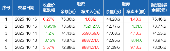 融资方面,当日融资买入6.5亿元,融资偿还4.82亿元,融资净买入1.68亿元,净买入额两市排名第14。融券方面,融券卖出11.14万股,融券偿还9.71万股,融券余量44.2万股,融券余额974.61万元。融资融券余额合计75.46亿元。