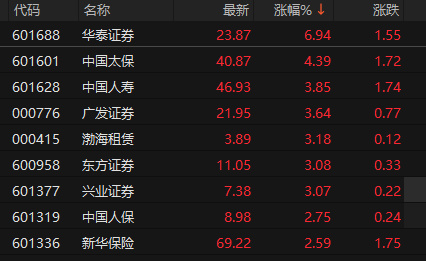 上证报中国证券网讯 12月17日午后,非银金融板块拉升,截至14时21分,华泰证券涨近7%,中国太保涨超4%,中国人寿、广发证券、渤海租赁等涨逾3%。