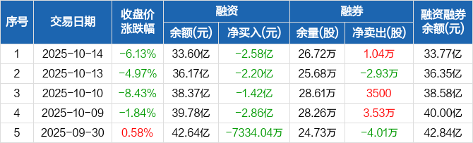 拓普集团融资融券信息显示,2025年10月14日融资净偿还2.58亿元;融资余额33.6亿元,较前一日下降7.12%。