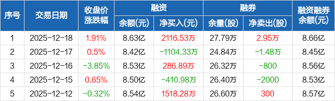 融资方面,当日融资买入5261.52万元,融资偿还3145万元,融资净买入2116.53万元。融券方面,融券卖出3.21万股,融券偿还2600股,融券余量27.79万股,融券余额341.26万元。融资融券余额合计8.66亿元。