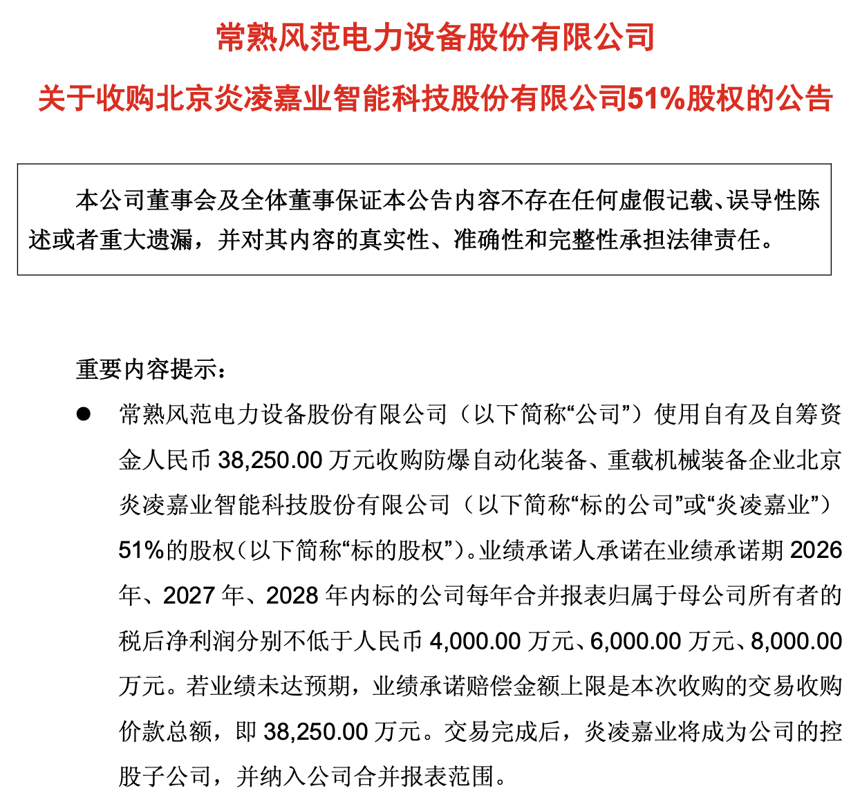 1月26日,风范股份(601700)发布公告,公司使用自有及自筹资金3.83亿元收购防爆自动化装备、重载机械装备企业北京炎凌嘉业智能科技股份有限公司(简称“标的公司”或“炎凌嘉业”)51%的股权。