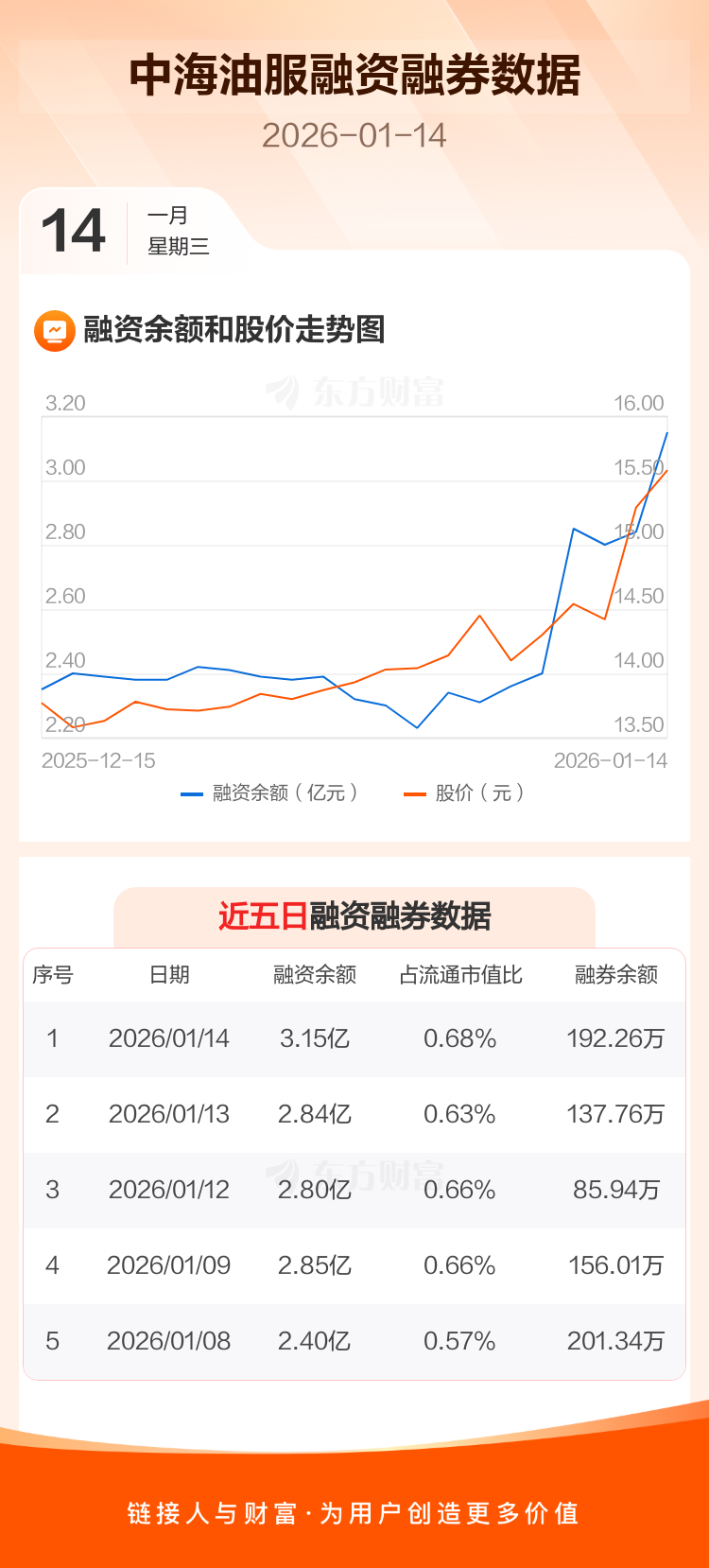 交易所最新数据显示,中海油服于2026年1月14日获融资买入9547.62万元,融资偿还6430.92万元,当日融资净买入3116.7万元。目前,该股融资余额3.15亿,占流通市值比例为0.68%。