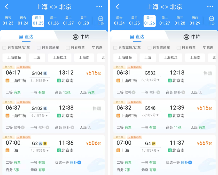 需要注意的是,此次调图后,部分列车始发站发生变化,如原本上海虹桥站开往宁波的G7519次、G7601次列车,均改为上海南站始发。同时,许多列车车次编号也发生变化,比如京沪高铁每天从上海出发前往北京的首班车G104次就改成了G532次,出发时间也有所变化。因此,旅客购票时须看清车次、到发站、到发时间等关键信息。