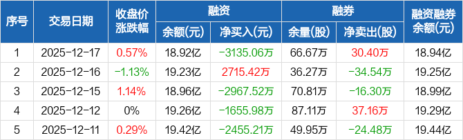 光大银行:融资净偿还3135.06万元,融资余额18.92亿元(12-17)