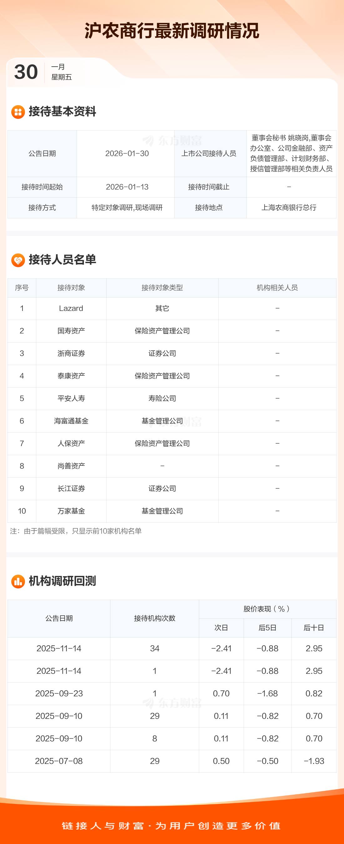 沪农商行1月30日公告称,1月13日接待Lazard等35家机构调研。接待人员包括董事会秘书 姚晓岗,董事会办公室、公司金融部、资产负债管理部、计划财务部、授信管理部等相关负责人员。