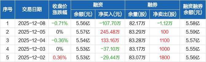 紫金银行:融资净偿还107.7万元,融资余额5.56亿元(12-08)