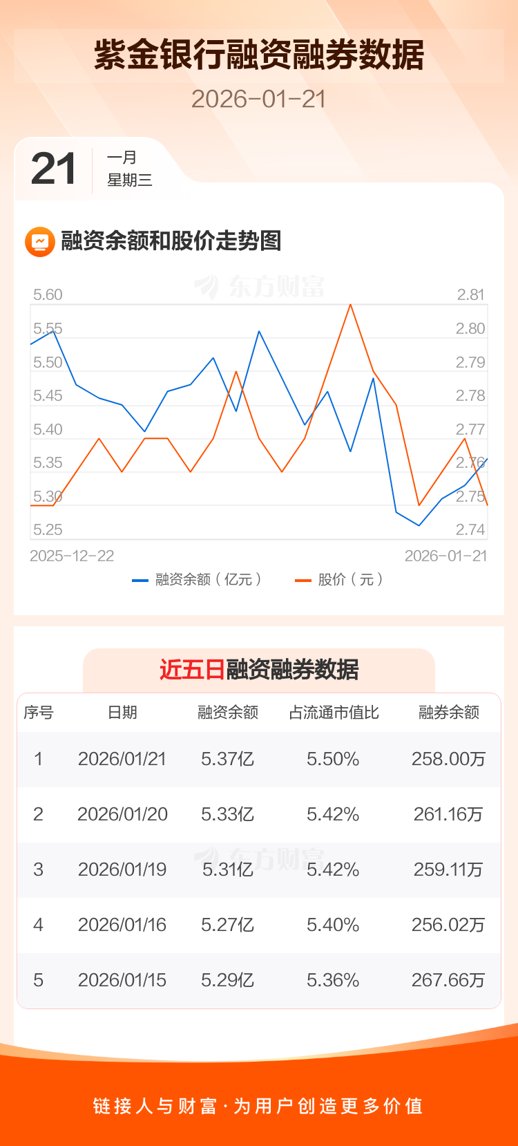 交易所最新数据显示,紫金银行于2026年1月21日获融资买入1750.11万元,融资偿还1385.40万元,当日融资净买入364.71万元。目前,该股融资余额5.37亿,占流通市值比例为5.50%。
