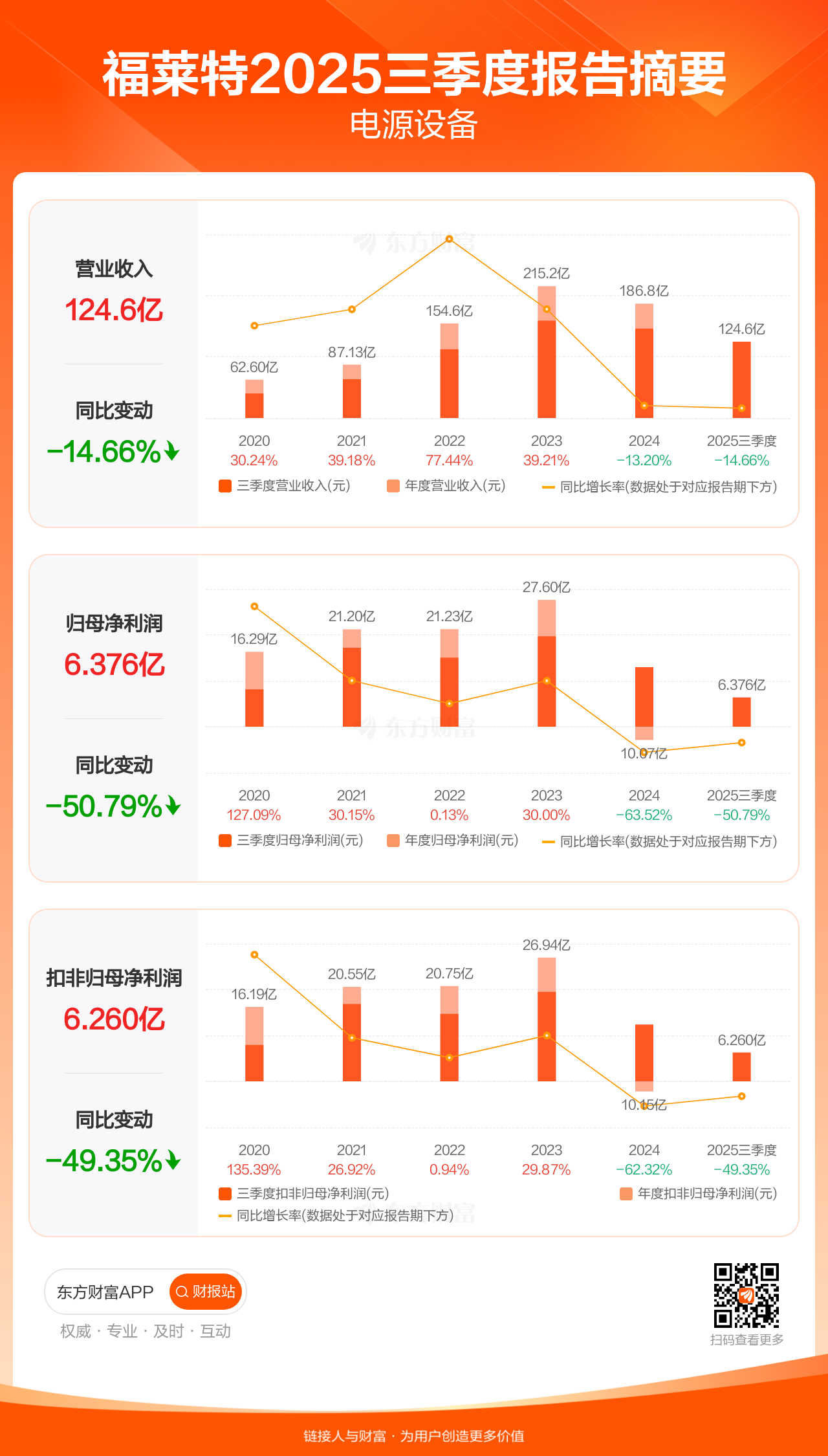 福莱特10月28日发布2025年三季报显示,公司前三季实现营业收入124.64亿元,同比下滑14.66%;归母净利润6.38亿元,同比下滑50.79%;扣非归母净利润6.26亿元,同比下滑49.35%。