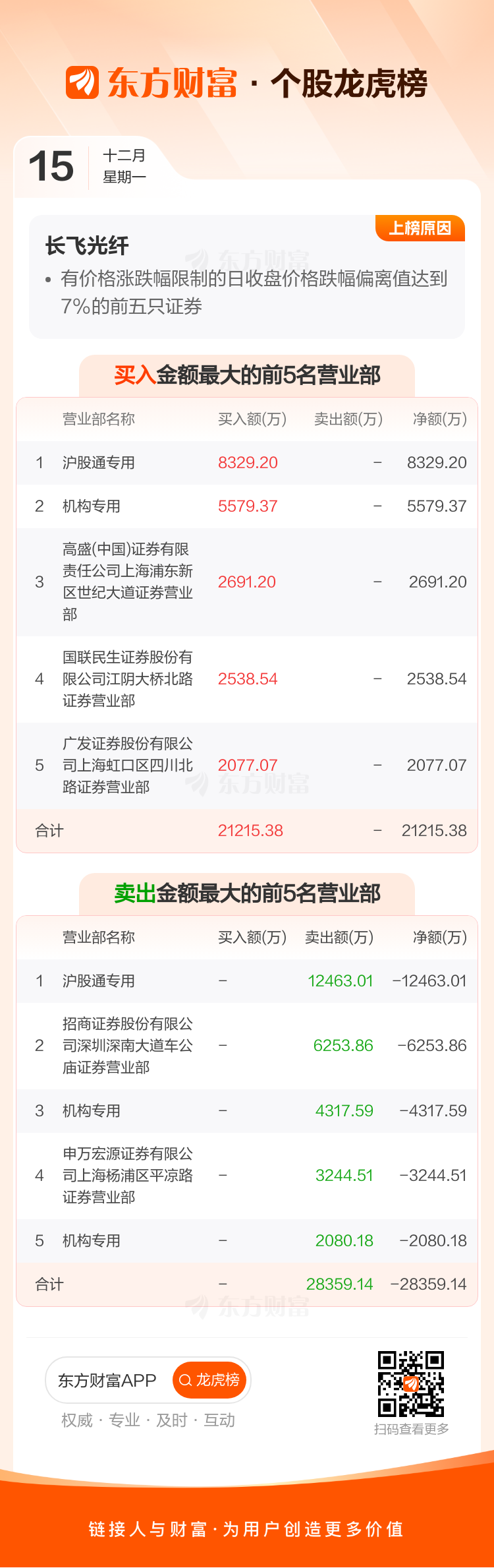 交易所2025年12月15日公布的交易公开信息显示,长飞光纤因成为有价格涨跌幅限制的日收盘价格跌幅偏离值达到7%的前五只证券上榜。长飞光纤当日收报95.15元,涨跌幅-10.00%,偏离值-9.45%,换手率5.13%,成交额20.10亿。