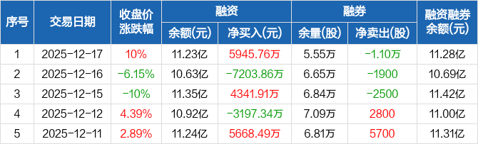 融资方面,当日融资买入3.86亿元,融资偿还3.26亿元,融资净买入5945.76万元。融券方面,融券卖出1400股,融券偿还1.24万股,融券余量5.55万股,融券余额544.84万元。融资融券余额合计11.28亿元。