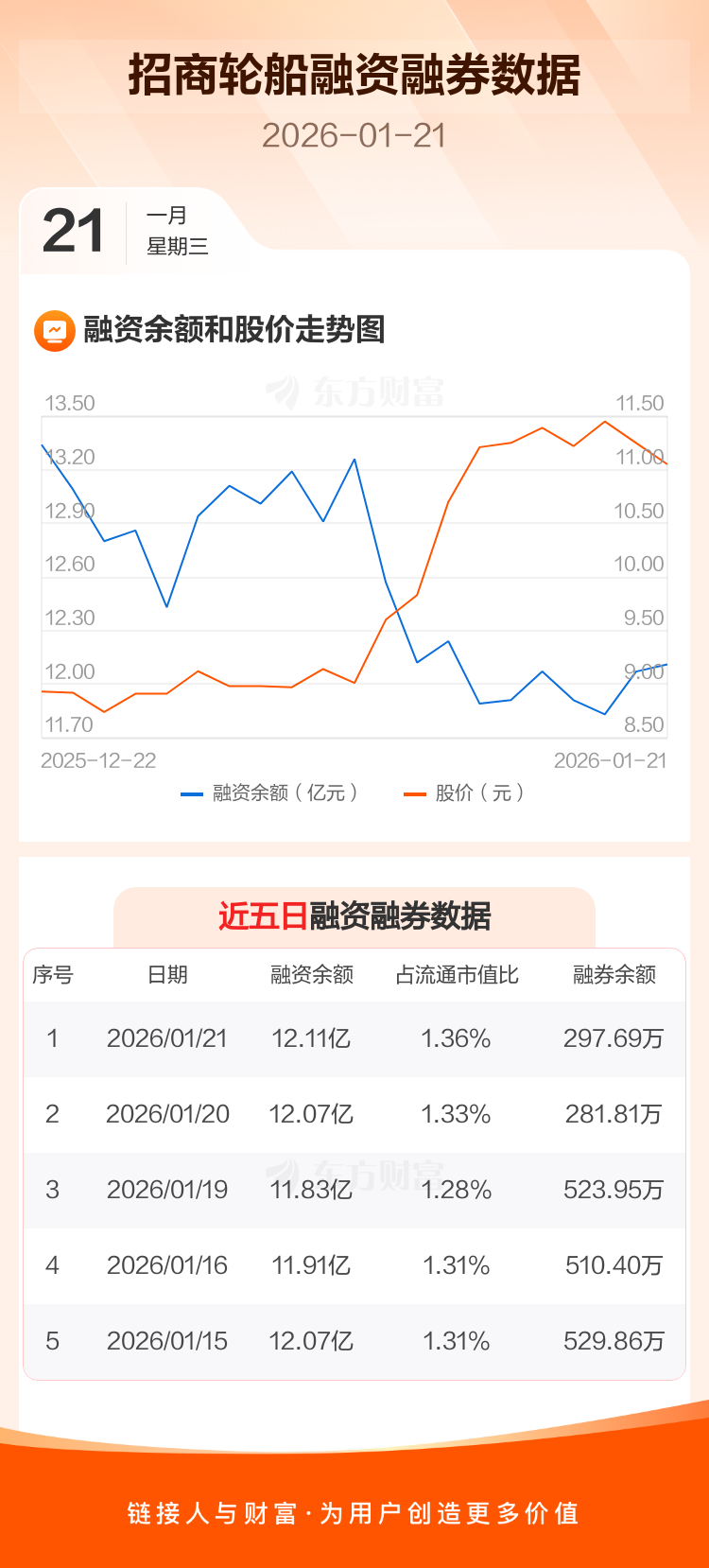 交易所最新数据显示,招商轮船于2026年1月21日获融资买入8037.69万元,融资偿还7596.13万元,当日融资净买入441.56万元。目前,该股融资余额12.11亿,占流通市值比例为1.36%。