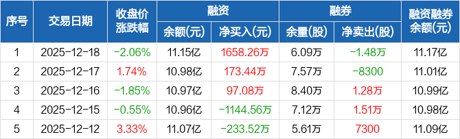 融资方面,当日融资买入5824.03万元,融资偿还4165.77万元,融资净买入1658.26万元,连续3日净买入累计1928.78万元。融券方面,融券卖出1400股,融券偿还1.62万股,融券余量6.09万股,融券余额171.01万元。融资融券余额合计11.17亿元。